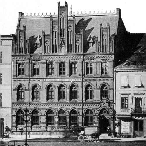 To neogotycki budynek poczty w zachodniej pierzei Rynku Staromiejskiego, wybudowany w 1881 r. Po lewej – hotel Sanssouci, który potem wchłonęła poczta.
