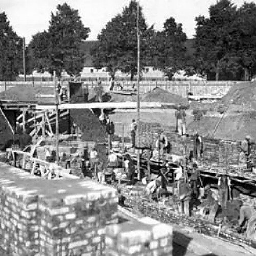 Budują Budynek Dyrekcji PKP, pierwotnie projektowany jako Pomorski Urząd Wojewódzki. W tle – Arsenał artyleryjski