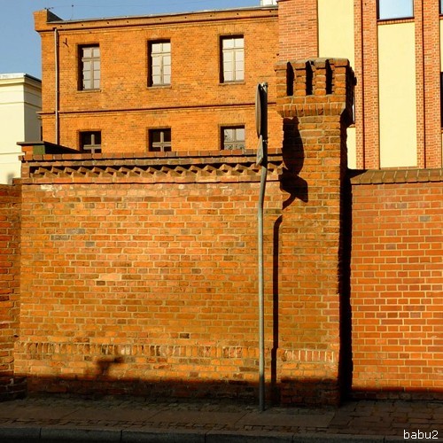 Mur przy kościele NMP. Za murem dom gazownika.