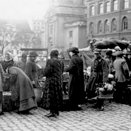 Takie dorodne marchewki i kapusty kupić można było tylko na Rynku Staromiejskim 🙂 Żołnierz dzierżący w dłoniach kosz z warzywami to zapewne ordynans tego pana oficera, którego żona lubiła mieć czyste dywany, ten sam, który wyschnięte poligonowe błoto wytrzepywał na głowy przechodniów 😉