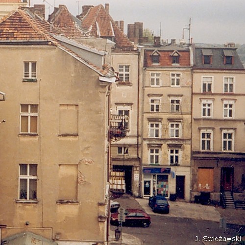 3. Zdjęcie wykonane zapewne z Baszty Gołębnik. Na pierwszym planie ul. Bankowa, widoczna tylna elewacja kamienicy narożna przy ul. Żeglarskiej 1, w tle Żeglarska – kamienice nr 2 i 4.