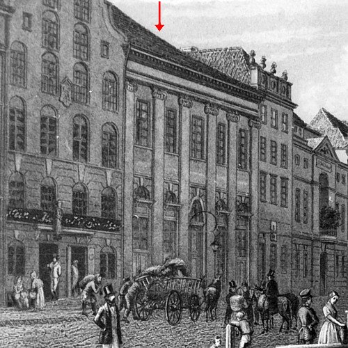 Dwór Artusa według projektu Hackerta z 1826 (zastąpił rozebrany na początku XIX w. gotycki Dwór Artusa). Wraz z dwiema sąsiednimi kamienicami rozebrany w 1889 r i zastąpiony obecnym neoklasycystycznym budynkiem.