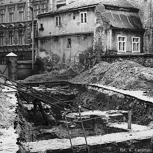 Wykopaliska prowadzono na terenie wczesniej tutaj znajdujacego sie POLMOZBYTU. Jeszcze wczesniej stal tutaj Kościół św. Mikołaja i klasztor dominikanów, wzniesiony w XIV, rozebrany w XIX wieku. W głębi znajduje sie ulica Strumykowa a po lewej i prawej niewidoczne Zaulek Prosowy i Most Paulinski.