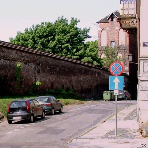 To ul. Bankowa widziana od strony Żeglarskiej. W tle baszta Gołębnik