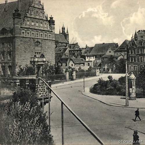 Na pierwszym planie,a dokładniej w lewym dolnym rogu, widać fragment Bramy Bydgoskiej ,już nie istniejącej.