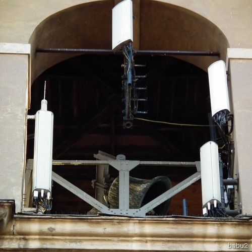 Anteny telefonii komórkowej na wieży kościoła Świętego Ducha