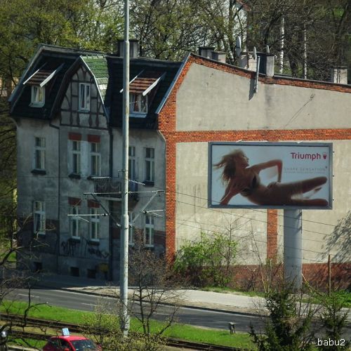 A tak na marginesie…czuję się zniesmaczony widząc takie i podobne reklamy na głównych budynkach miast. No bo co to jest ten Triumph ? To nie ten angielski sportowy cabrioliolet 6-cio cylindrowym silnikiem, ani też angielska zastawa stołowa…. to producent majtek i biustonoszy. Mam nie smaczne skojarzenia ( choć też lubię majteczki czerwone -zwłaszcza je zdejmować ).