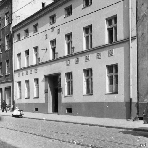 ul.Św.Katarzyny 13 – tz.Dom Rzemiosła .Tu mieścił się Zakład Doskonalenia Rzemiosła , Zarząd Cechu Rzemiosł Różnych a od 1990 Z.D.Z w Toruniu .Skuter to pewnie Lambretta model z połowy lat 60 XX wieku .Fotka może pochodzić z 1968….?